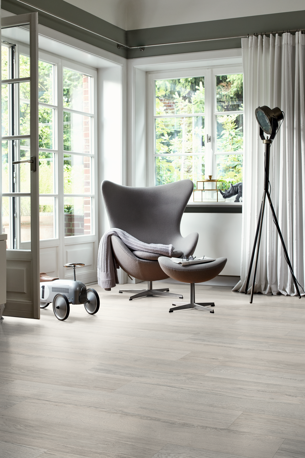 Stejar Elva gri este un stejar crăpat modern, de culoare gri deschis. Crăpătura este realizată cu finețe și culorile sale se integrează armonios în imaginea decorului. În încăpere, decorul arată calm și discret cu culori deschise.