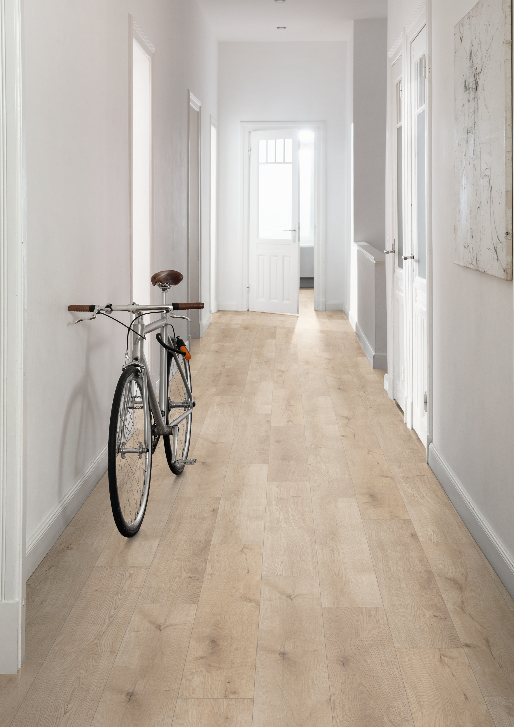 Decorul Stejar Lausanne deschis are un efect de lemn elegant. Acest decor de pardoseală prezintă caracteristicile tipice ale stejarului într-o nuanță foarte deschisă de culoare și un aspect echilibrat. Nodurile mici și crăpăturile fine ies în evidență pe fondul maro deschis discret.